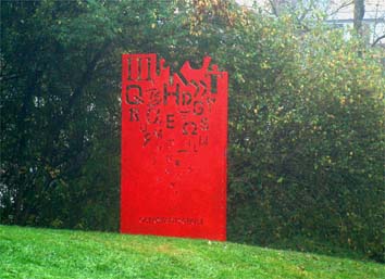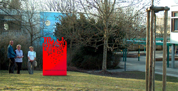 ...und hier ist die fertige Skulptur vor der Oberstadtschule Weingarten installiert (Einweihungsfoto an einem nebligen Oktobertag).