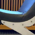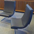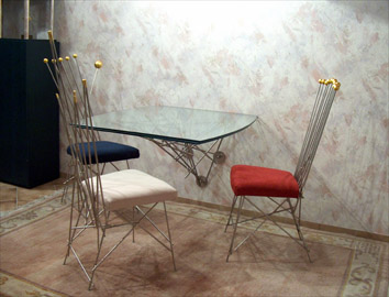 Glastisch ohne störende Tischbeine und überraschend bequeme Stühle aus Edelstahl mit blattvergoldeten Details, Bezüge Alcantara.